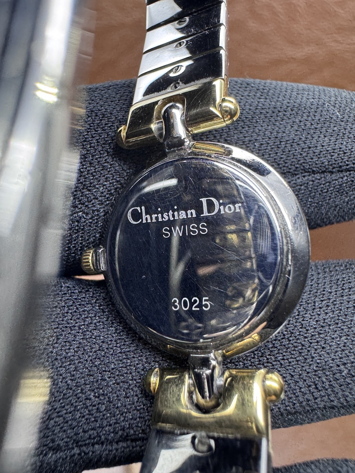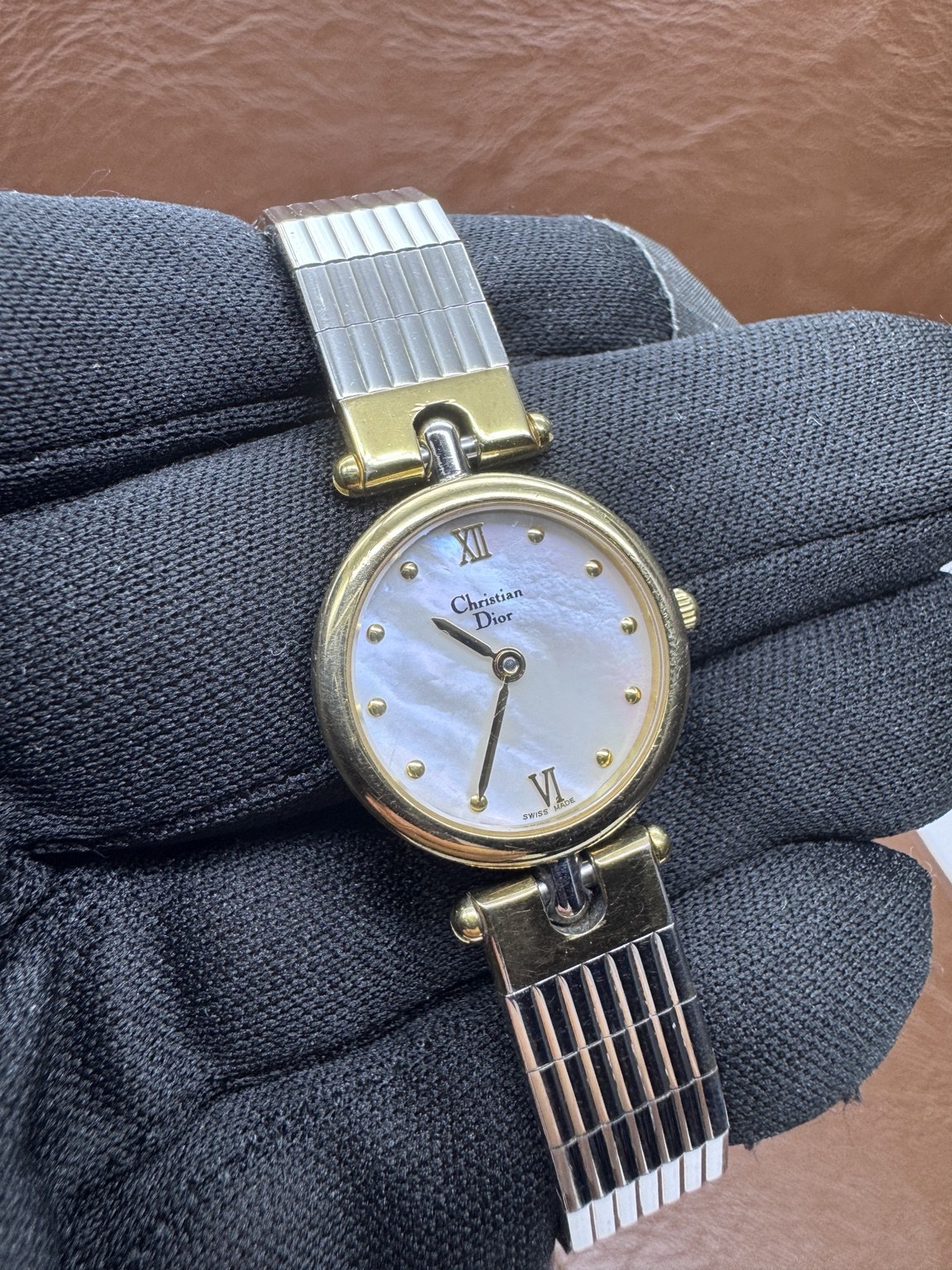 ساعة كريستيان ديور فنتج بتصميم بسيط وأنيق، تتميز بواجهة صدف أبيض تضيف لمسة فاخرة ومميزة.
