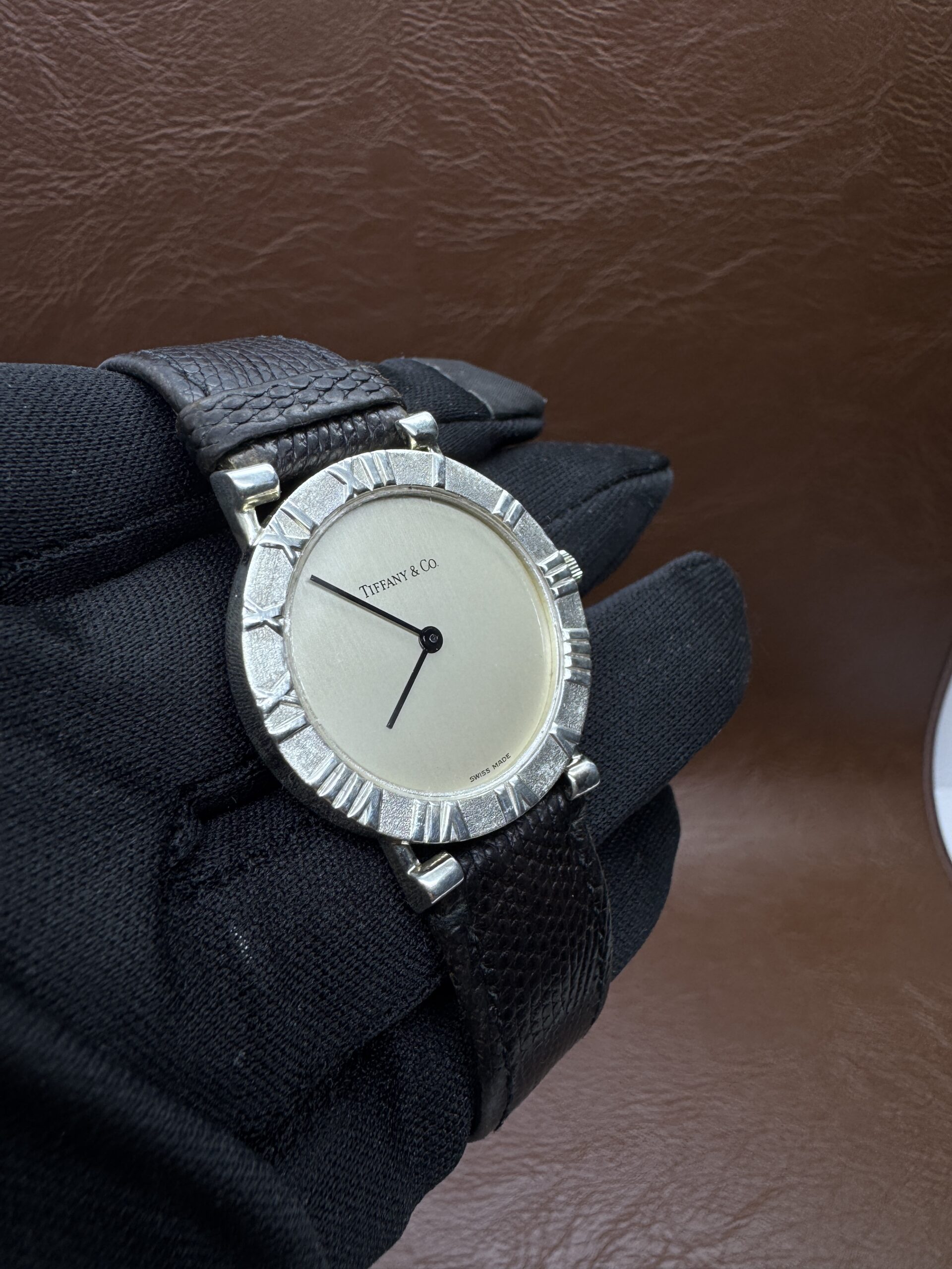 ساعة فاخرة من Tiffany & Co.، تتميز بعلبة دائرية كلاسيكية من الفضة مع إطار بأرقام رومانية وميناء بسيط ونظيف. اللون الفضي مع سوار جلدي يعكس أناقة خالدة وفخامة هادئة.